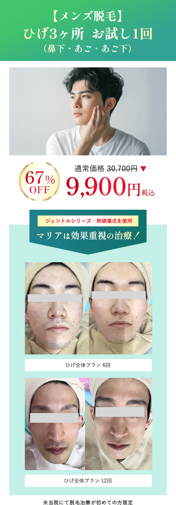 医療脱毛 メンズひげ 3箇所 お試し1回【税込9,900円】
