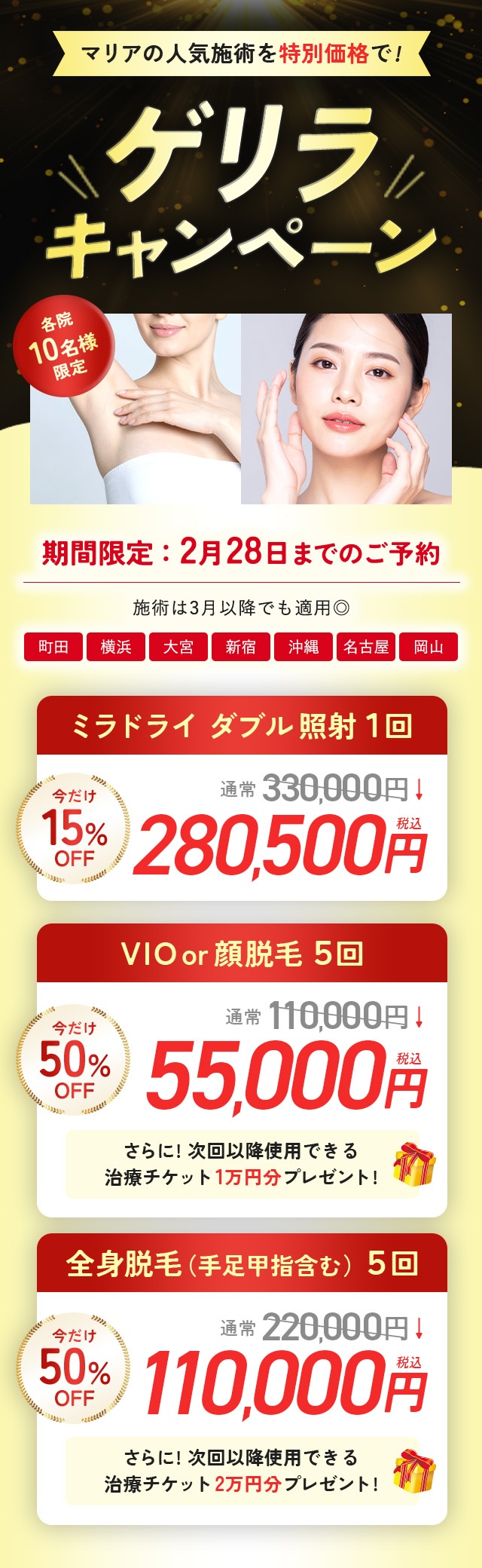 女性医療脱毛 VIO or 顔脱毛 5回【税込¥55,000円】
